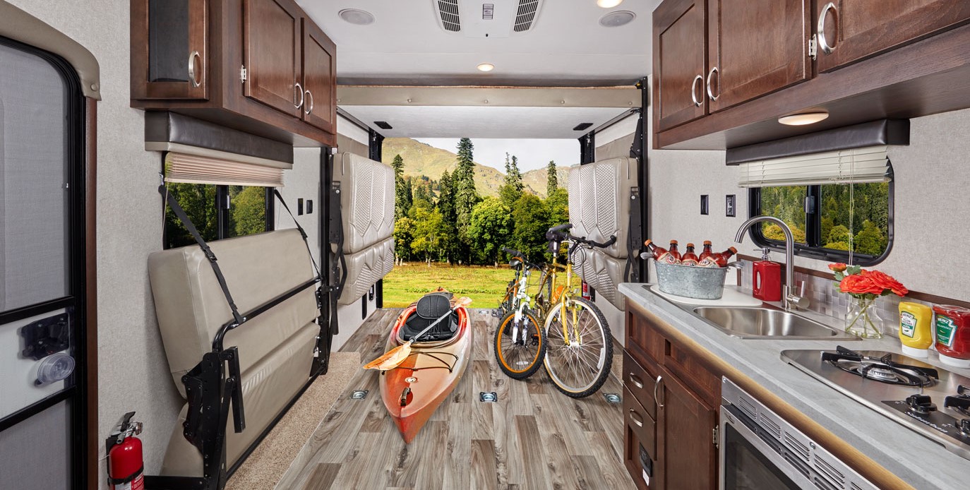 Toy hauler RVs bear the name for good reason: their built-in garage areas allow outdoor enthusiasts the ability to take their favorite toys to camp. Kayakers, ATVers, dirt bikers, surfers, snowmobilers and all kinds of adventurers love having a comfortable living space and large cargo area all in one vehicle.