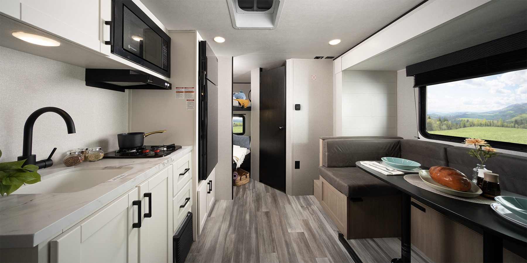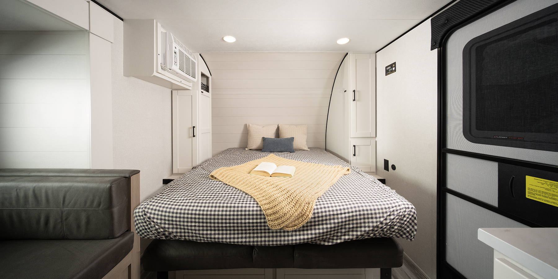 Inside, you’ll find solid hardwood cabinet doors with hidden hinges, giving the space a modern, residential feel. Oversized cabinets and under-bed storage ensure there’s room for everything you need, while the lit exterior passthrough storage makes packing and unpacking a breeze.
