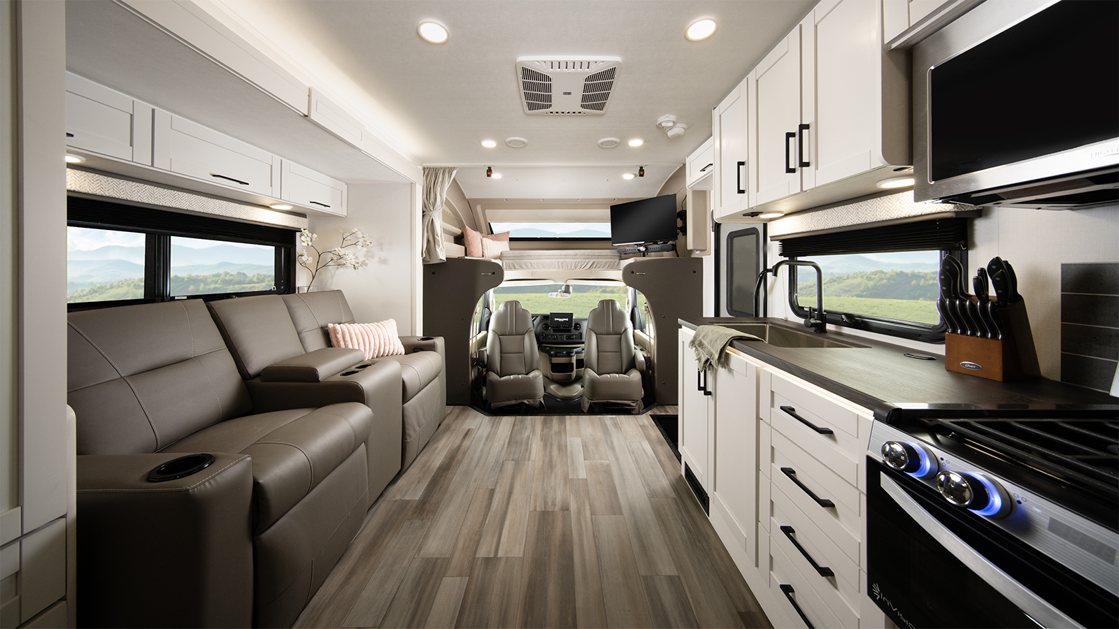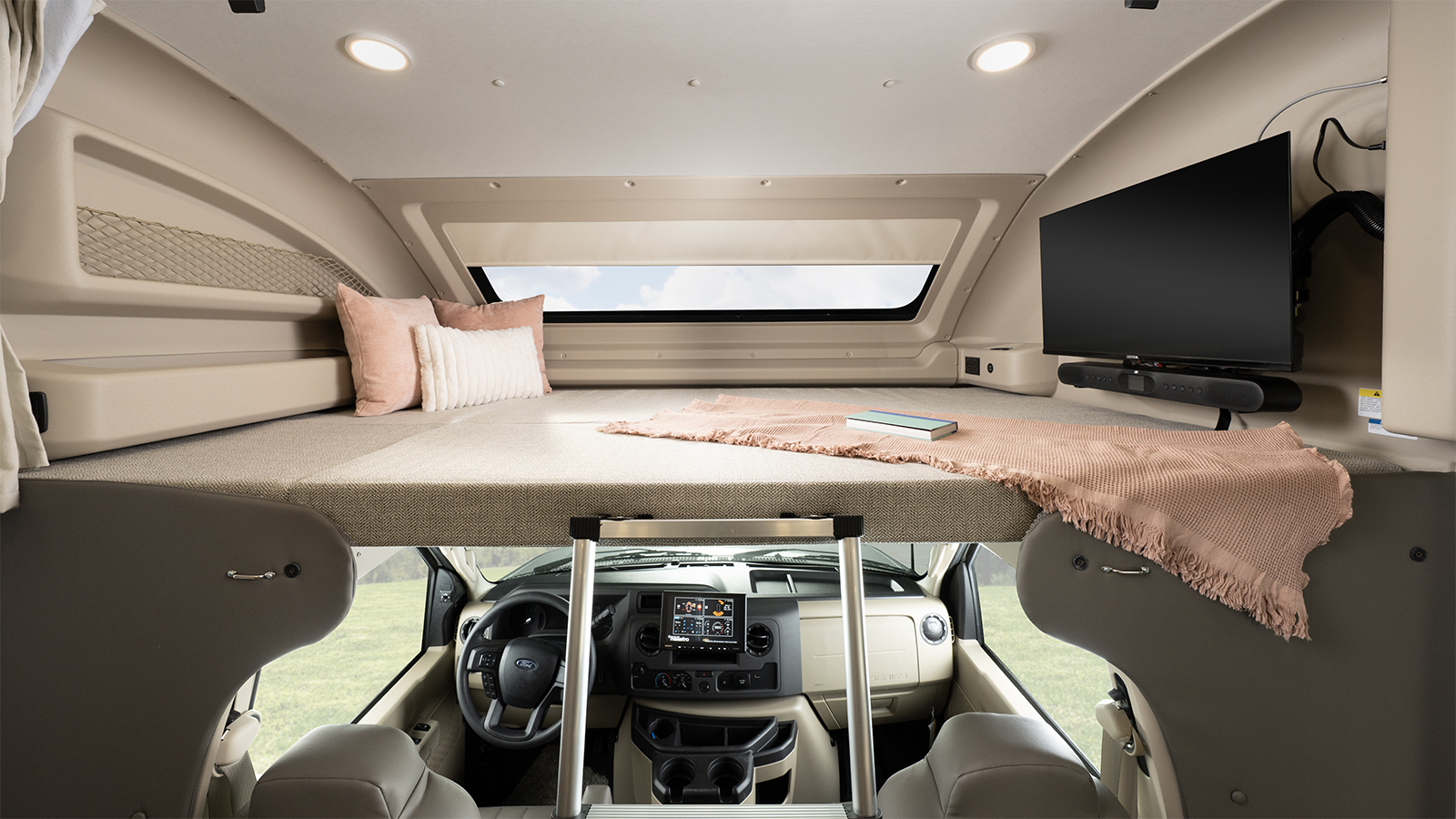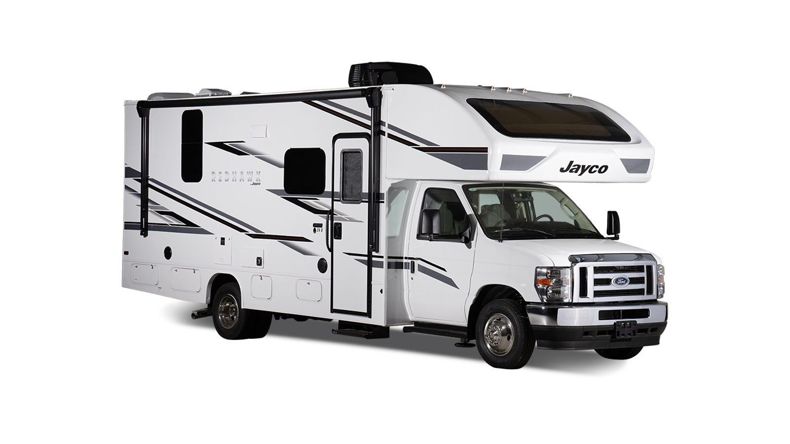When you step up your Class C ownership with Jayco’s Redhawk, you're stepping into a new level of RV excellence. The differences between the Redhawk and Redhawk SE are clear from the start, beginning with the Redhawk’s sleek, frameless windows that give it a clean, automotive look while protecting seals from harmful sun exposure. That means a longer lifespan and fewer trips to the shop. Safety is also a priority, with side-view cameras offering full visibility down both sides of the coach while turning or changing lanes. The JRide® handling package adds to the smooth experience, with features like a computer-balanced driveshaft, front and rear stabilizer bars, Hellwig® helper springs, and rubber isolation body mounts. It all comes together for a ride that’s quiet, comfortable, and easy to enjoy—whether you're on a short getaway or a long haul. The one-piece seamless front cap is the only one of its kind on the market. This cap is designed to drastically reduce the risk of leaks in the most common location on a Class C motorhome. With Jayco’s extra attention to durability and detail, you’ll spend more time on the road and less time in the service bay. An automotive-bonded panoramic window in the cap adds to its appeal and provides stunning views from the overhead bunk. Staying cool is easy, too, with a standard 15,000 BTU ducted A/C or the option to upgrade to dual 13,500 BTU units with a power management system, so comfort is always part of the journey.