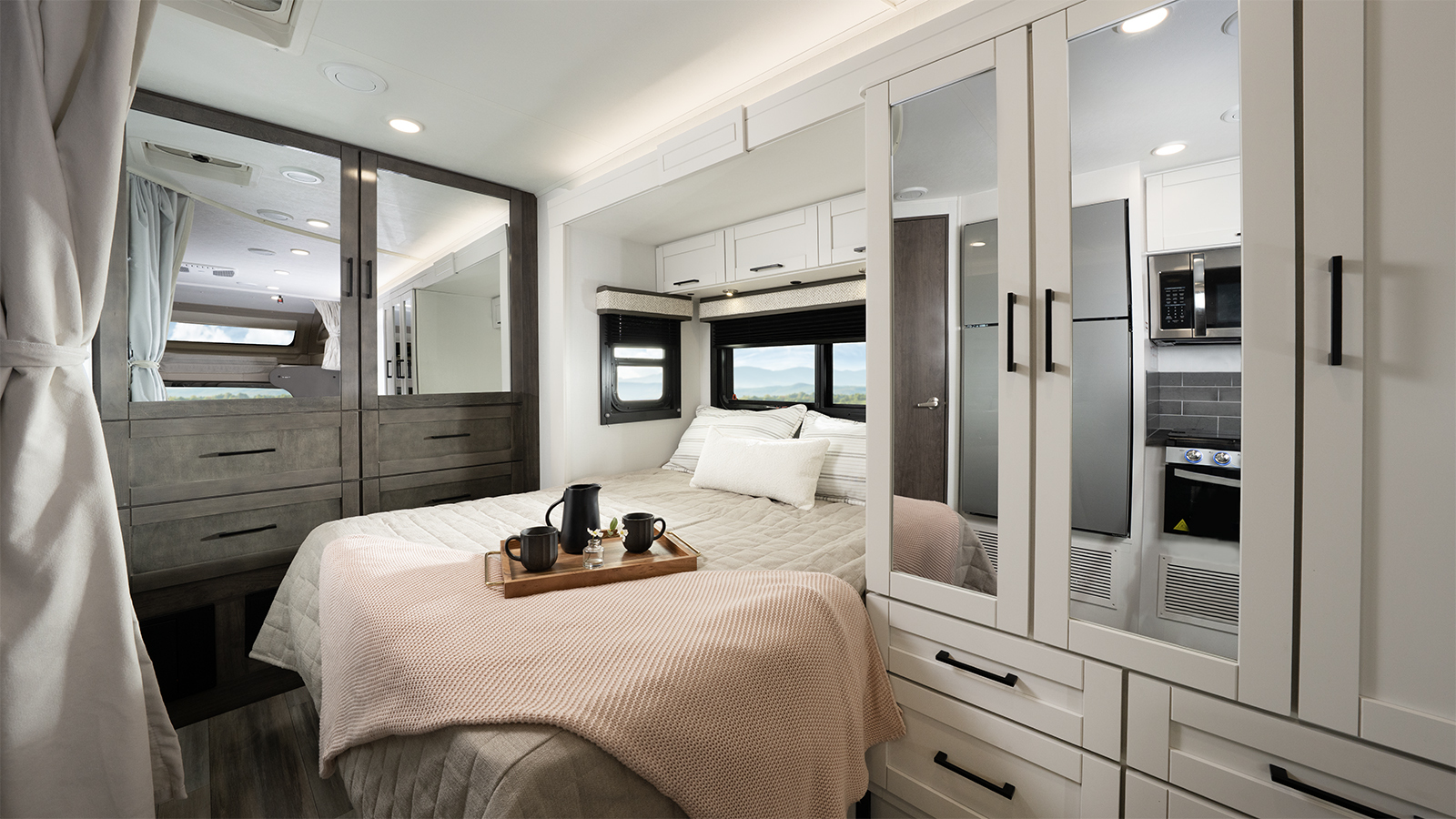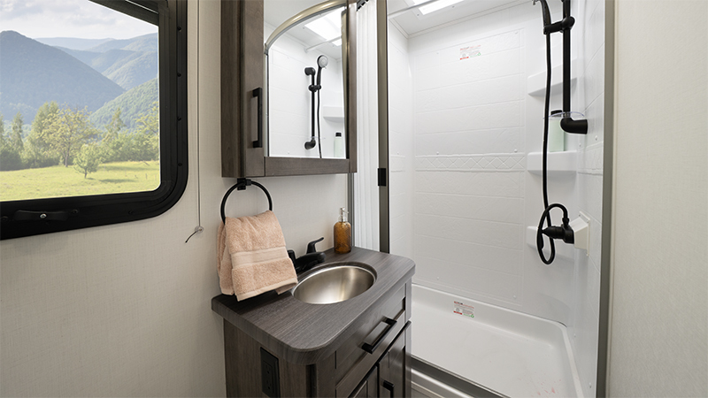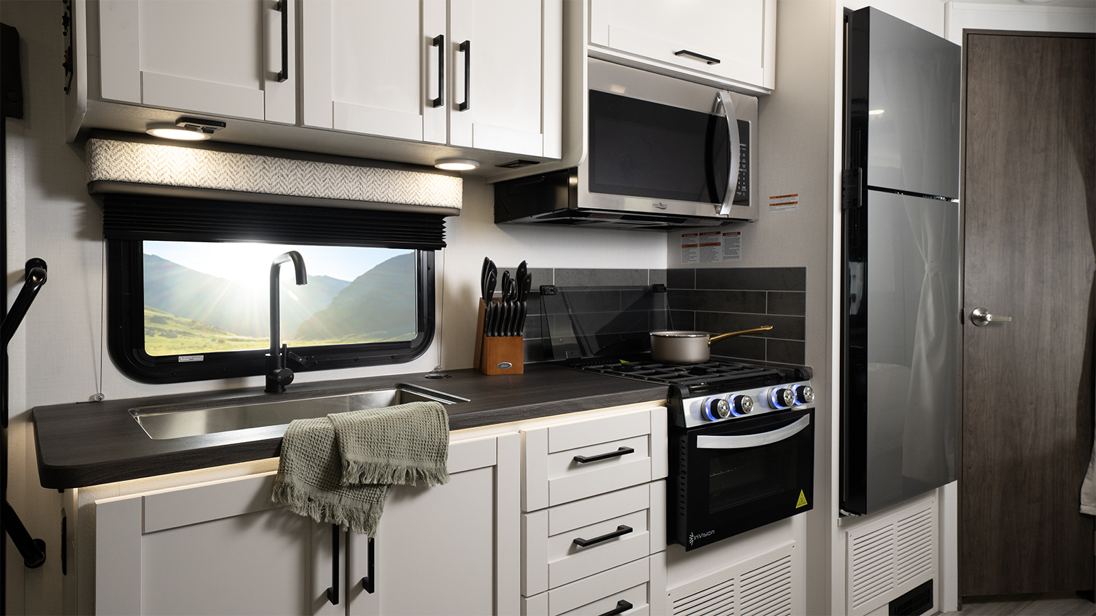 When you step up your Class C ownership with Jayco’s Redhawk, you're stepping into a new level of RV excellence. The differences between the Redhawk and Redhawk SE are clear from the start, beginning with the Redhawk’s sleek, frameless windows that give it a clean, automotive look while protecting seals from harmful sun exposure. That means a longer lifespan and fewer trips to the shop. Safety is also a priority, with side-view cameras offering full visibility down both sides of the coach while turning or changing lanes. The JRide® handling package adds to the smooth experience, with features like a computer-balanced driveshaft, front and rear stabilizer bars, Hellwig® helper springs, and rubber isolation body mounts. It all comes together for a ride that’s quiet, comfortable, and easy to enjoy—whether you're on a short getaway or a long haul. The one-piece seamless front cap is the only one of its kind on the market. This cap is designed to drastically reduce the risk of leaks in the most common location on a Class C motorhome. With Jayco’s extra attention to durability and detail, you’ll spend more time on the road and less time in the service bay. An automotive-bonded panoramic window in the cap adds to its appeal and provides stunning views from the overhead bunk. Staying cool is easy, too, with a standard 15,000 BTU ducted A/C or the option to upgrade to dual 13,500 BTU units with a power management system, so comfort is always part of the journey.