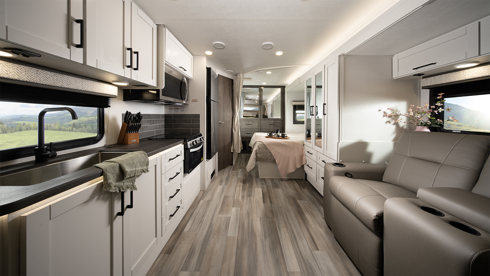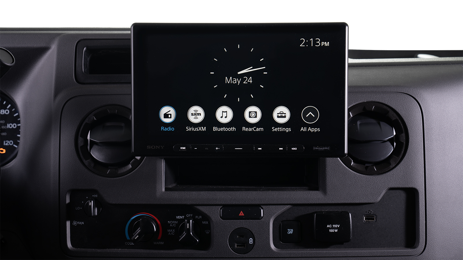 Inside, the Redhawk offers touches that feel right at home, starting with hardwood cabinet doors and drawers, reduced visible stiles for a clean finish and a full-size residential microwave. The dining area features Jayco’s exclusive legless dinette table, which is sturdy, easy to operate, and quickly converts from mealtime to bedtime mode. There are seatbelts in every seating location, and child safety tethers in the dinette, ensuring your family's safety during travel. Up front, the 9-inch Sony® infotainment system includes Apple® CarPlay™, Android Auto™ and a tilt feature, offering a bright, easy-to-read display that helps you stay connected and focused on the road. From its smart safety features to elevated design inside and out, the Redhawk Class C delivers a first-class RV experience that’s ready for the road ahead.