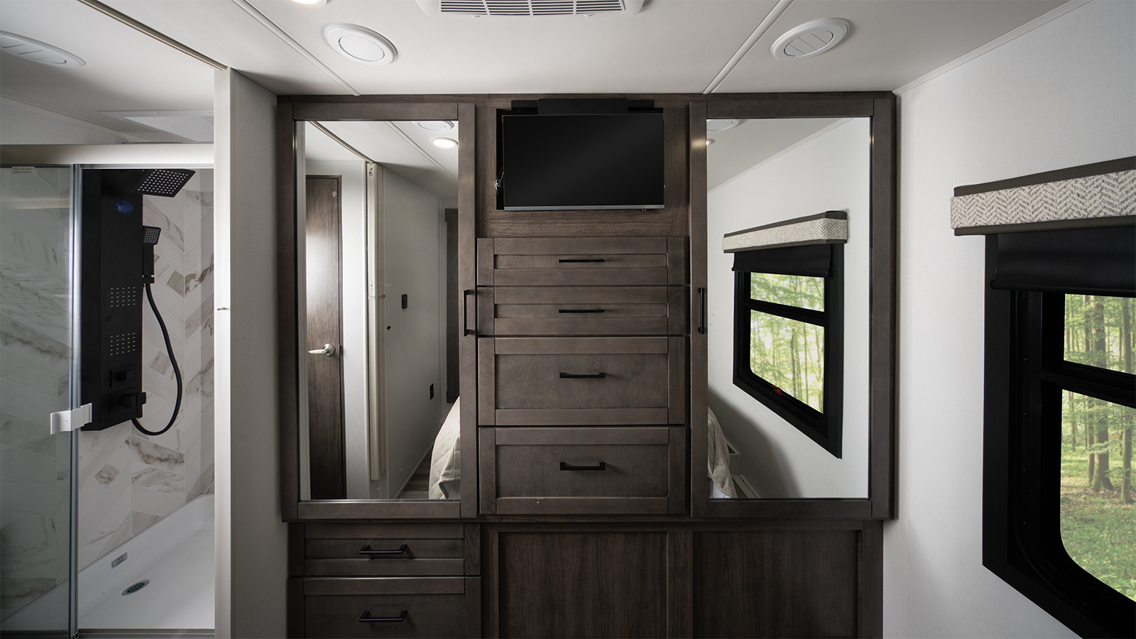 Inside the Greyhawk, comfort comes standard. Unwind on the walk-around queen-size (king-size on the 27U) bed while your devices stay charged using the built-in USB ports or wireless charging pads in the nightstands. The Jayco-exclusive legless dinette table easily converts from dining to sleeping position and is built to stay sturdy and supportive, even during mealtime or family game night. Every seating area includes safety belts, and the dinette is equipped with car seat tethers to keep little ones secure on the road. Outside, large rotocast storage compartments offer plenty of space and are easy to clean with a quick spray from the hose. Whether you're headed to the mountains, beach or somewhere in between, the Jayco Greyhawk blends luxury and practicality to help you make the most of every trip.