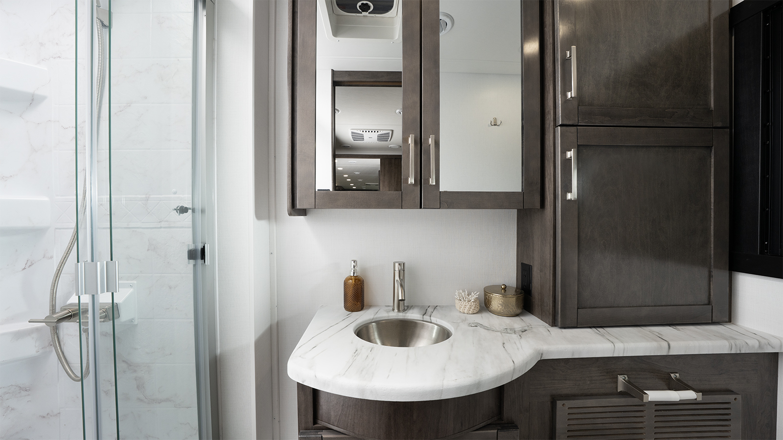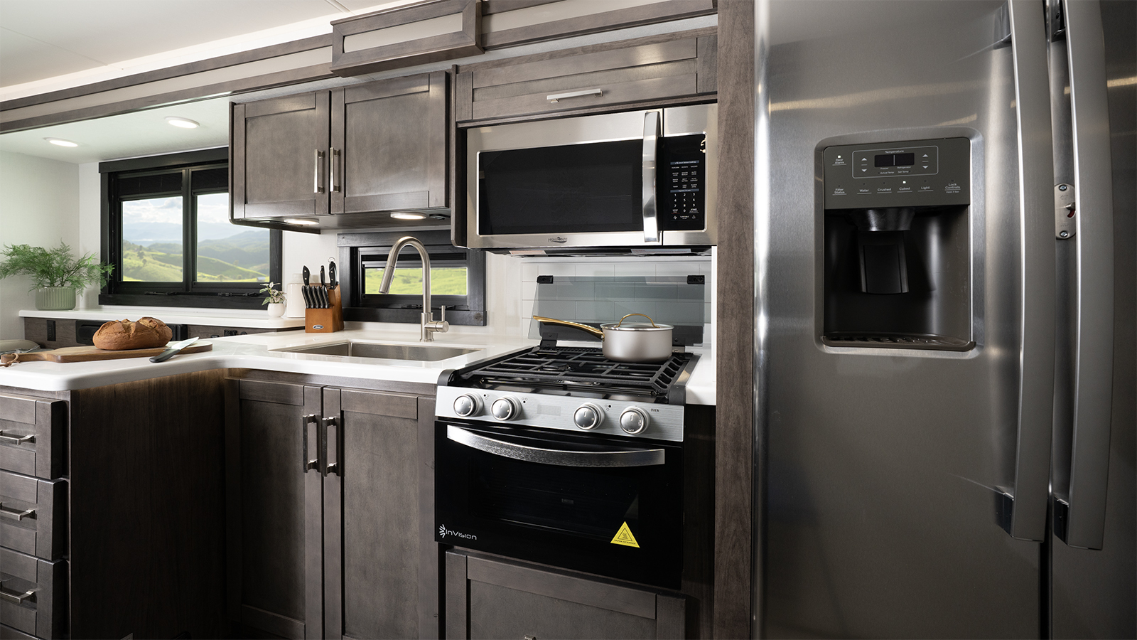 In the kitchen, you’ll love the solid-surface countertops which are not only durable but easy to clean and maintain. A large stainless steel sink makes dish duty simple, and sink covers give you more space when you need it. The 21-cubic-foot residential fridge makes it easy to bring along all your favorite snacks and ingredients. With large hardwood cabinet doors and drawers throughout, there’s space for everything you need—with a clean, home-like look.