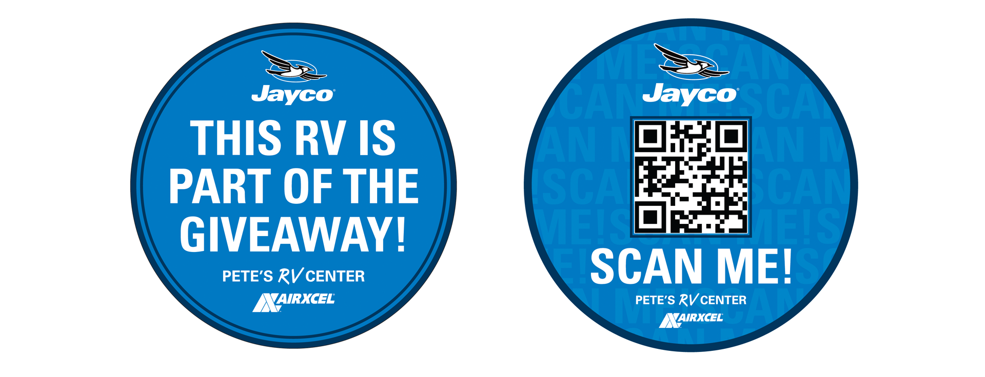 You will need to follow along on a scavenger hunt. There are 5 QR codes placed in Jayco RVs throughout the Pete’s RV Center display. Start in the travel trailer section of the display. Each task will guide you on what RV to locate, enter and where to find the QR code to scan. After you complete the task, it will tell you where to find the next RV until you’ve scanned all 5 QR codes.